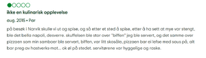 Hvis man blar gjennom utemrket og bra anmeldelsene, så skjønn man raskt at det er bare brukere med 1 anmeldelse (bots eller brukere fra resturanten for å booste) eller diverse utlendingsjallaer.